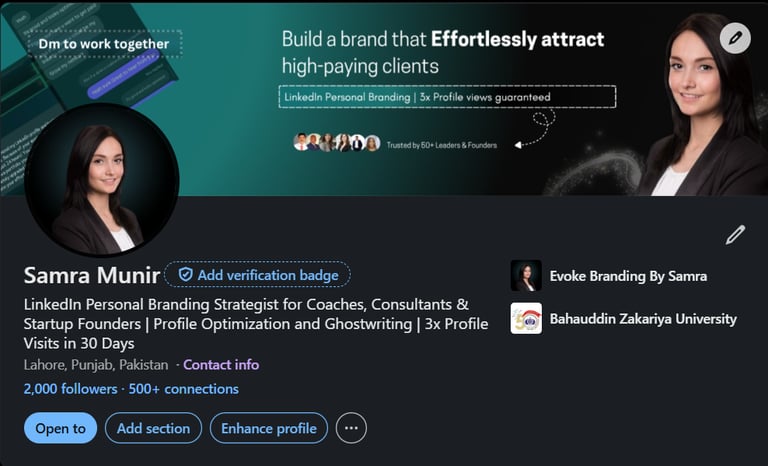With years of experience helping founders and coaches build authority on LinkedIn, I craft strategies that increase visibility, engagement, and inbound opportunities. Unlike others, I focus on turning your expertise into trusted authority through storytelling, strategic content, and profile systems that attract the right audience and convert connections into clients.
